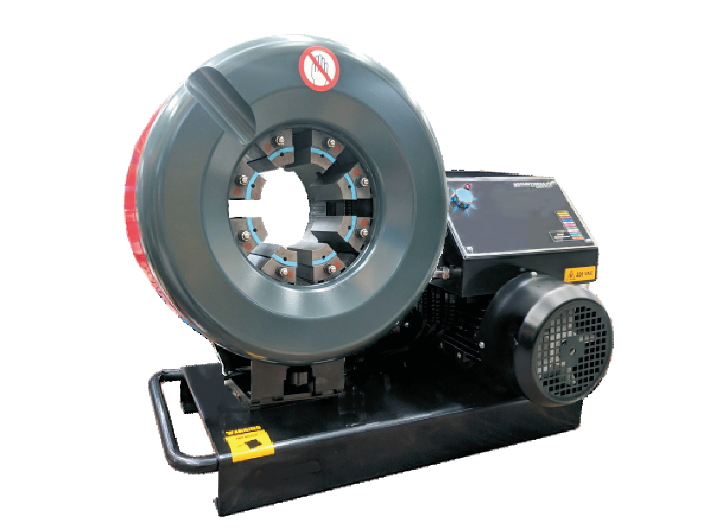 A precision 4" nom. swage press for the production of hose assemblies of all types. Designed specifically for portability, with versatile single phase supply, soft start and twin pumps. Robust, simple design with performance in mind, without electrical switchgear, employing single button operation with rapid automatic full retract after completion of swage. Patented rotating/auto lube shoe cluster provides continuous >97% crimping efficiency with automatic self lubrication.