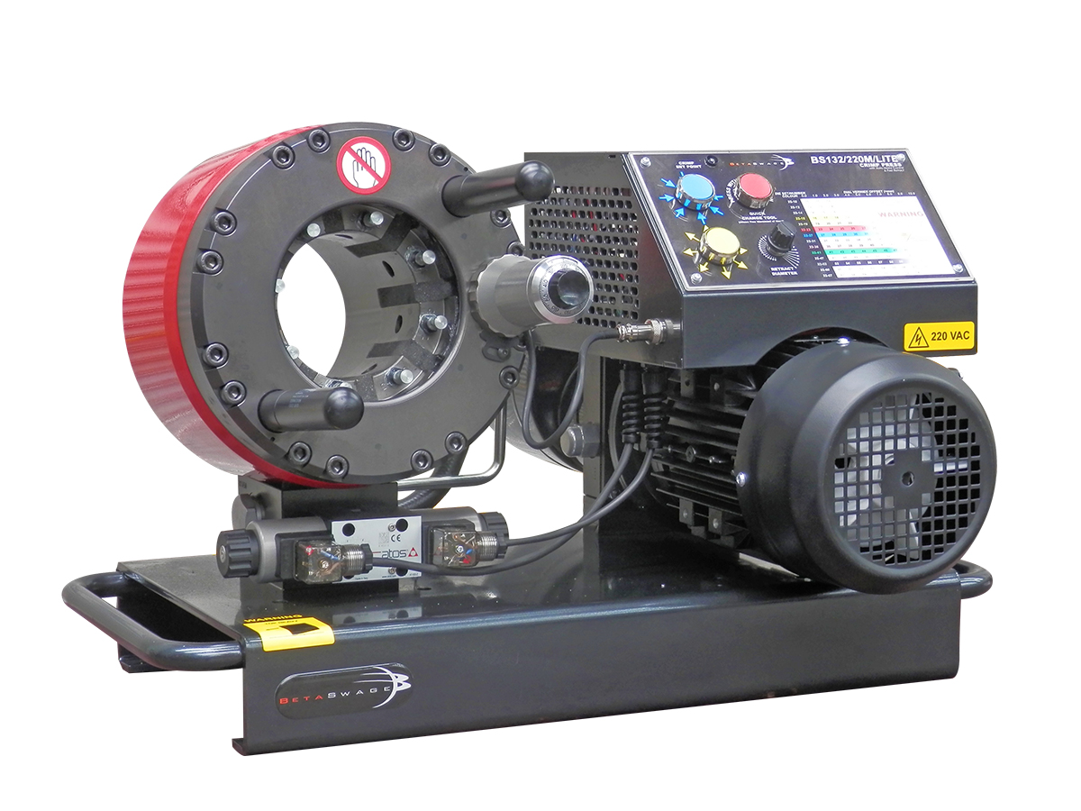 A precision 1-1/4" nom. swage press for the production of hose assemblies of all types. Designed specifically for portability, with versatile single phase supply. The press is of a design with a large aperture enabling optional die sets to 2" hose of light construction. The die sets used are those of a popular European “pin” design.