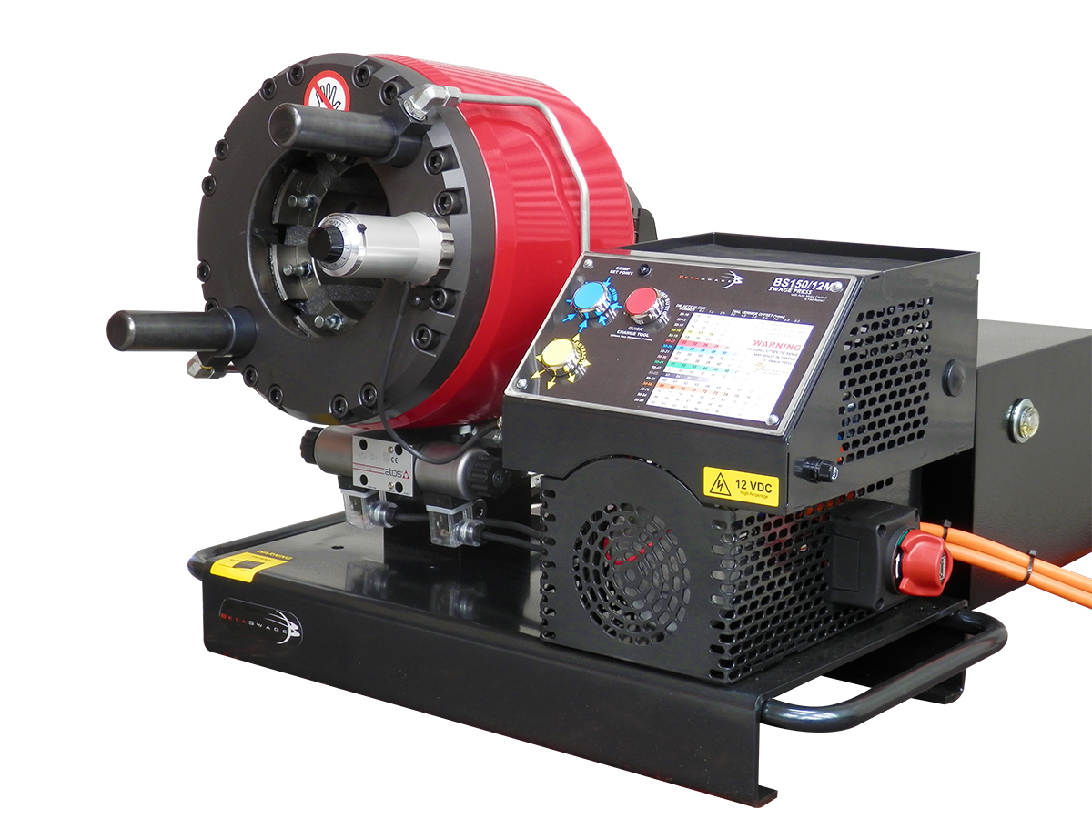 A precision 2" nom. swage press for the production of hose assemblies of all types. Designed specifically for mobile hose trucks with 12VDC supply and anti-spill reservoir breather. The press is of a design with a large aperture enabling optional die sets to 3" hose of light construction. The die sets used are those of a popular European “pin” design.