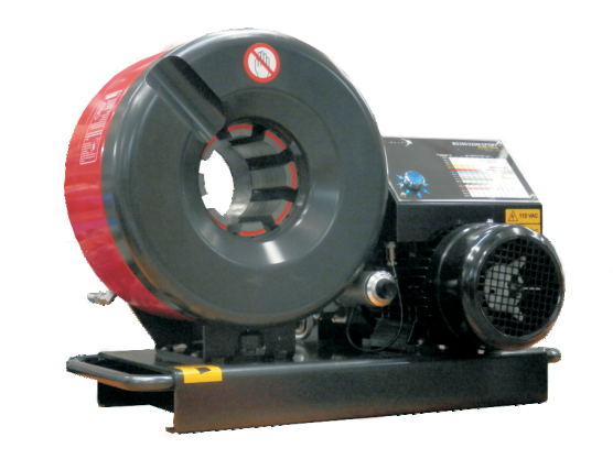 A precision 3" nom. swage press for the production of hose assemblies of all types. Designed specifically for portability, with versatile single phase supply. 110/220 VAC 50/60 Hz. The BS350/220M/SPORT has an indexing shoe cluster that provides auto lubrication with >97% efficiency. Single button operation where correct installed diameter is achieved, stopped, then automatic rapid retract to fully open position. Able to crimp all hydraulic hoses to 2" diameter/isobaric 6000.